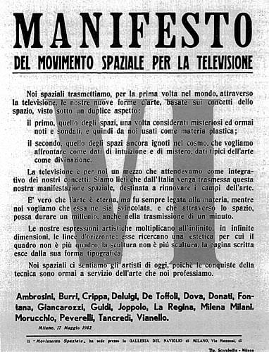 Nel 1951 firma a Milano il Manifesto dell' arte spaziale, e quindi il Manifesto del movimento spaziale per la televisione (1952).