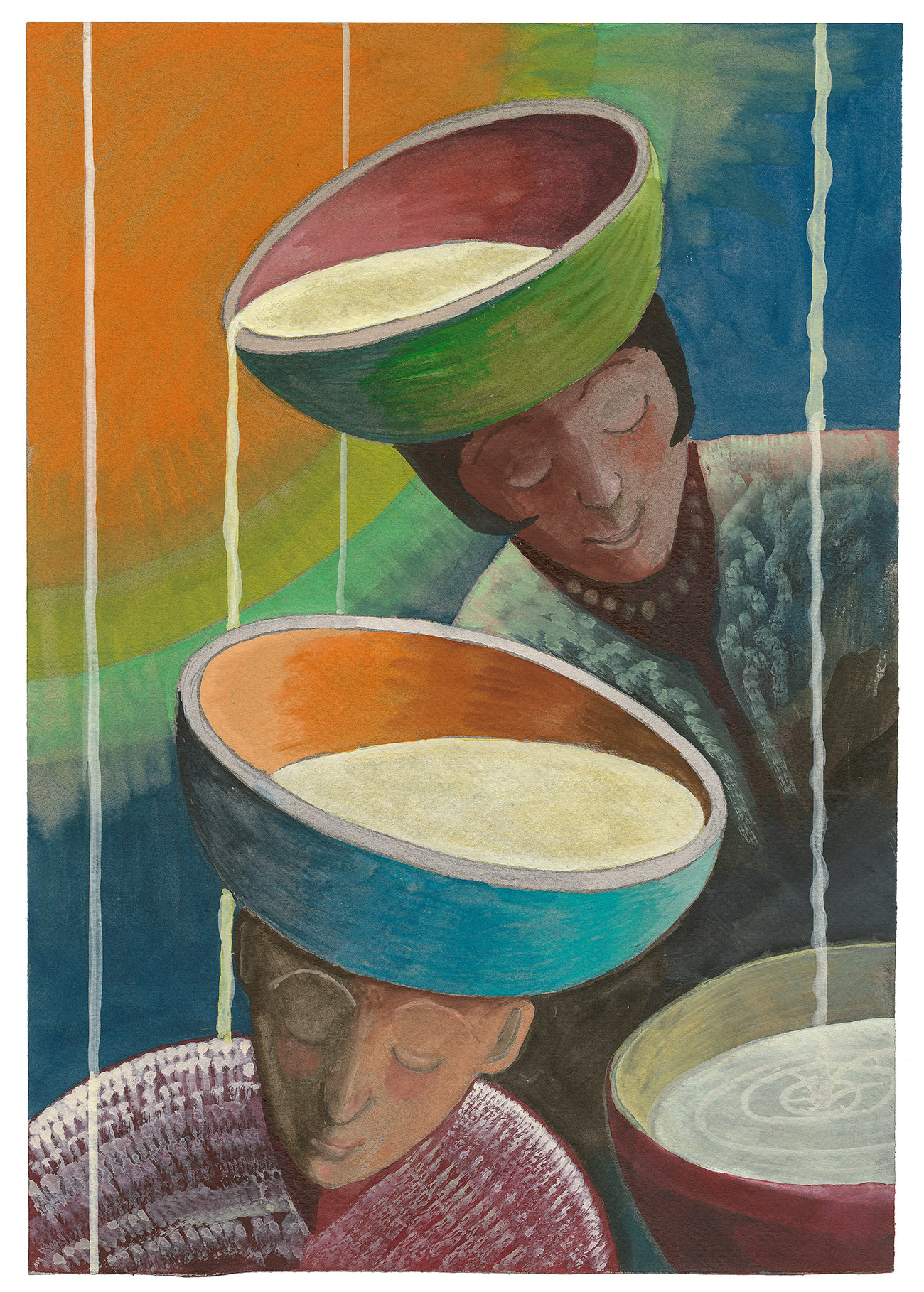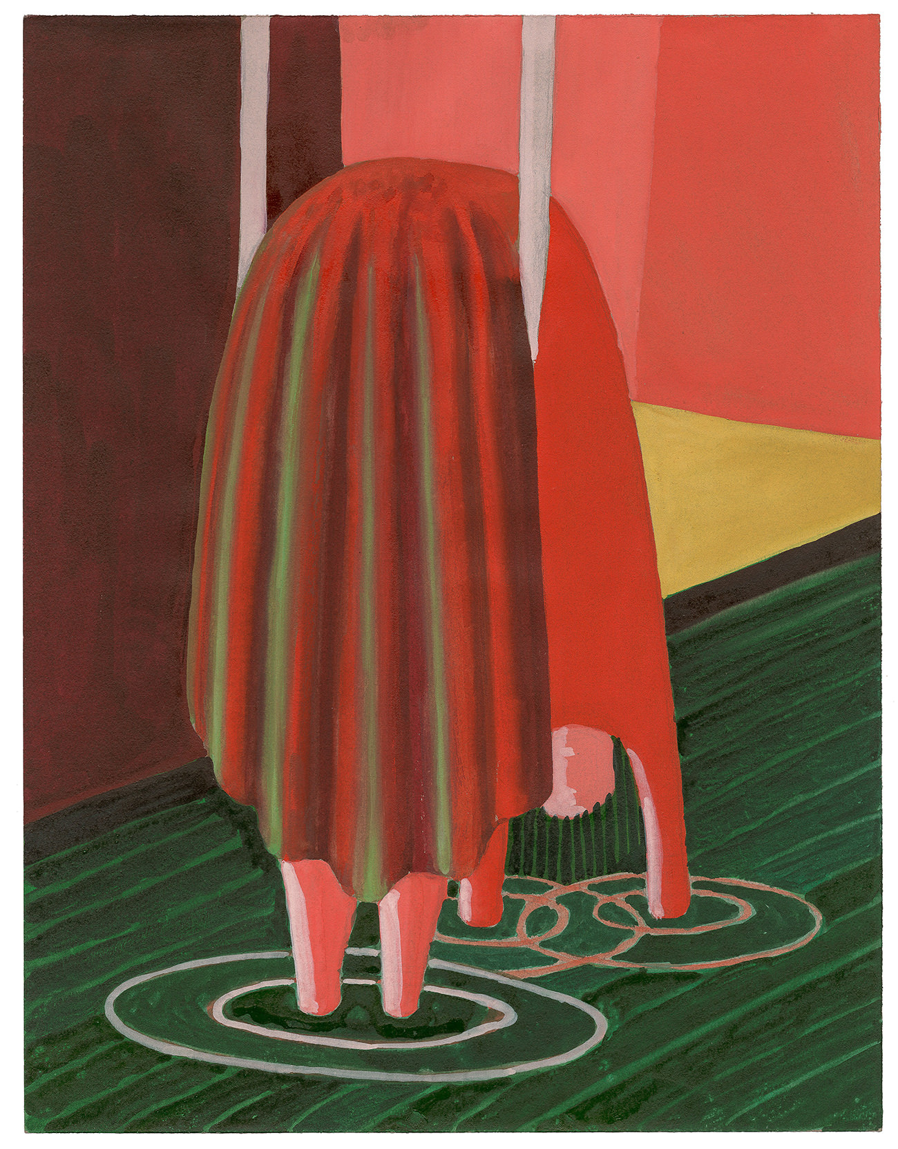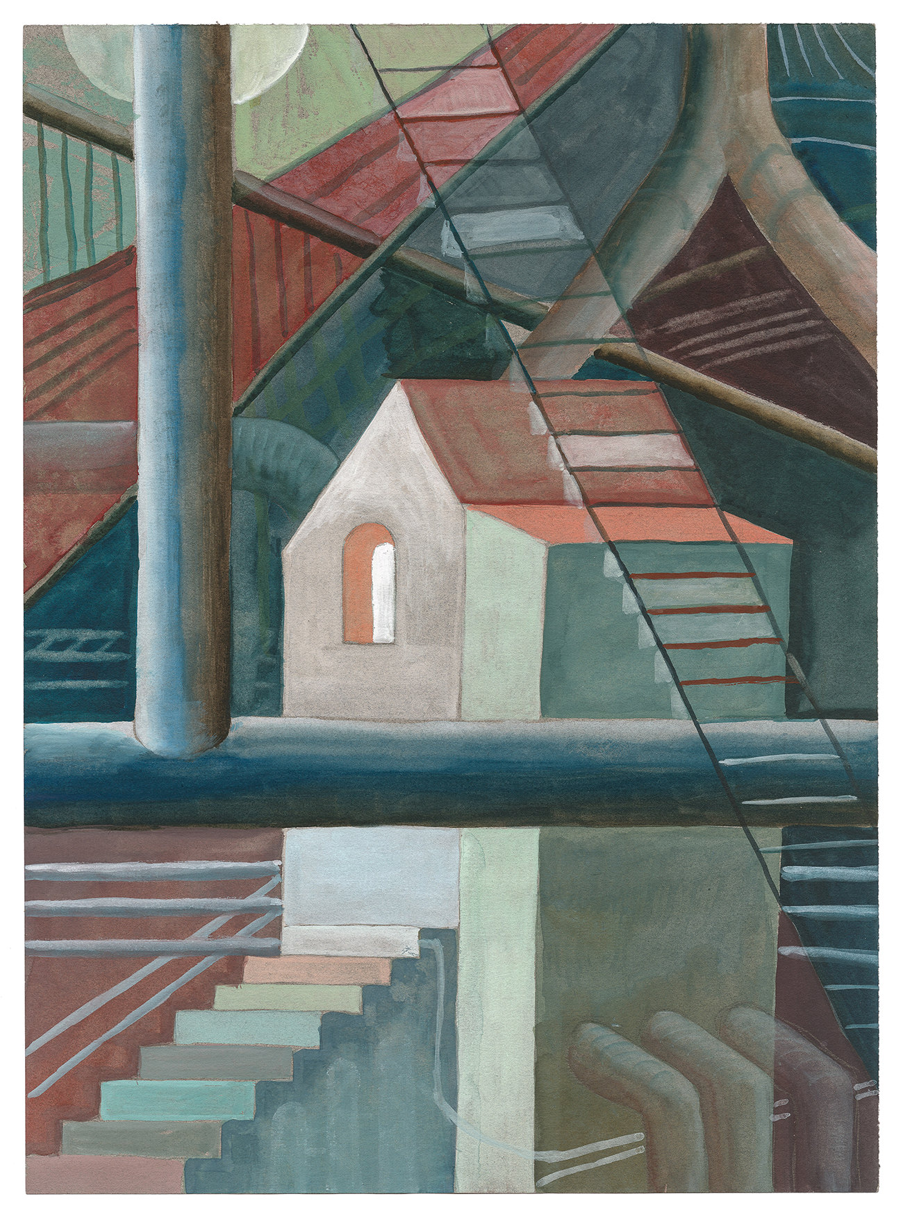 Il mondo pittorico di mia moglie è principalmente di natura privata. Il suo saggio d’esame si intitolava “Un diario pittorico” e conteneva disegni, acquerelli e fotografie, il tutto in un formato piuttosto piccolo e intimo. Ancora oggi le sue opere sono create sotto forma di appunti. Alla maniera di un diario, a questo lavoro pittorico corrisponde il piccolo formato, che lo spettatore deve avvicinarsi in modo che le persone si avvicinino solo quando hanno acquisito una maggiore familiarità. Il fatto che alla fine siano state create anche altre immagini di grande formato che possono essere percepite a distanza e che possono anche dispiegare il loro potere in una spazio più grande e meno privato è un nuovo sviluppo. Si tratta di ingrandimenti di piccoli originali di prima, per cui il posto dell’acquerello è stato preso dalla tempera all’uovo, che nella sua superficie opaca ricorda quasi la pittura ad affresco.