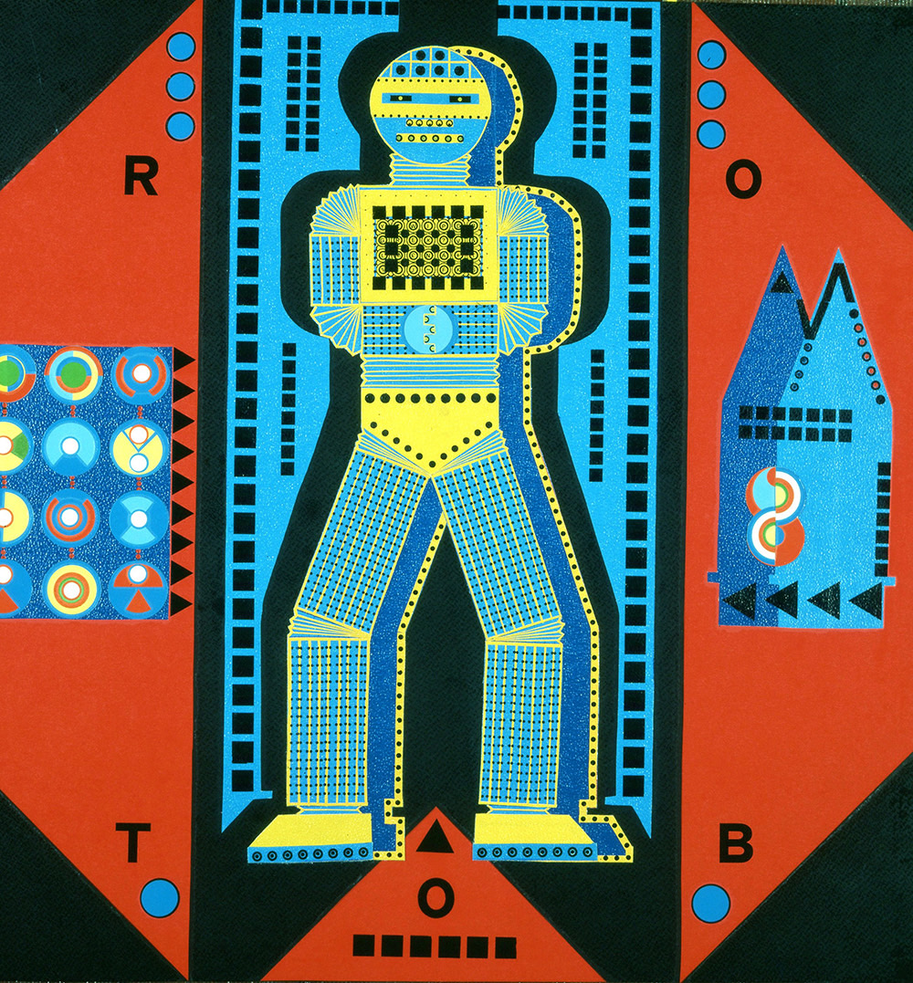 Non mancano in mostra collages creati con grande precisione. Attraverso l’ingegno e la sua maestria artistica, Guaccero compone queste opere utilizzando elementi già strutturati (trasferelli e trasferibili) e carte adesive meticolosamente ritagliate con taglierini e forbici. Alcuni si rivelano come veri e propri racconti, si veda la gigantesca balena bianca sul cui soffio si arrampicano piccoli bambini eschimesi mentre tutt’intorno sugli iceberg vediamo numerosi pinguini, o il futuristico robot inviato nello spazio, altri offrono una visione ludica dello studio della geometria come la coloratissima dimostrazione del Teorema di Pitagora. Viene presentata infine l’attività pittorica di Guaccero che si muove tra forme astratte biomorfe, caratterizzate da nette e compatte campiture ottenute ritagliando cartoncini colorati poi sovrapposti, e una ricerca figurativa, talvolta dai toni vagamente espressionisti, ma qui testimoniata anche da miti e rilassate figure in barca che si riparano dal sole sotto esili ombrellini. Le opere di Guaccero ci indicano la strada per recuperare quelle forme di piacere e divertimento che abbiamo perso, ci fanno riscoprire quella meraviglia tutta infantile che è in noi e che dobbiamo solo cercare.