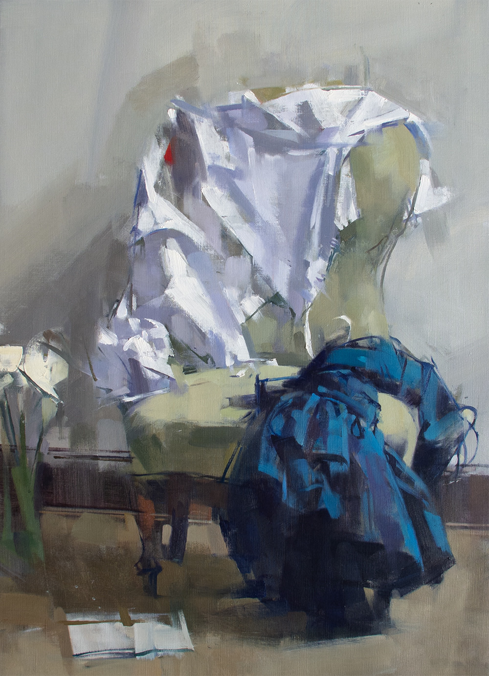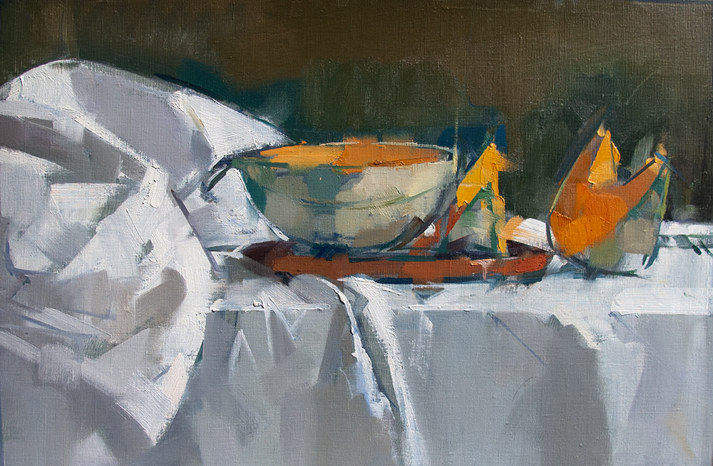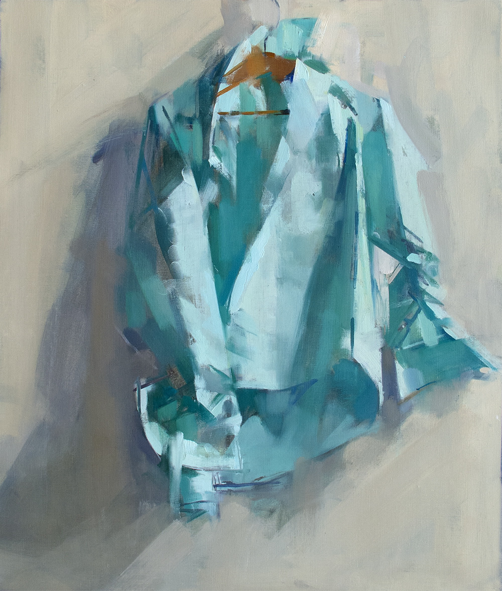 “What memories are carried by a tossed off article of clothing? By the detritus of the table? Why paint a shirt on a hanger? Rolls of toilet paper? Melon rinds on a cracked plate? Why paint from life at all? My paintings are not story telling in any narrative sense of the word, but the truer to life they are, the more convincingly they create the experience of having existed, and then the more they incite our human nature which wants to make stories of everything. A shirt freshly pressed is flat and neutral. But a shirt that has been worn, disturbed with folds, wrinkled by a human body who has moved, behaved and sweated, a shirt that has been worn and worn down and then insouciantly thrown on the hanger; that shirt contains the seeds of a narrative I will discover through the investigative and thrashing process of painting. I am very taken by the objects of daily life after they have been used. It’s there where we can see life passing; the remains of something that has happened. And that is what a painting is to me. It is something that has happened. I’ve painted figures all my life, portraitly confronting the direct gaze or voyeuristically looking over a shoulder, but I find that painting the objects, the stuff that figures have held, worn or used, offers a subtle poignancy and is suggestive of deeper interpretations.“