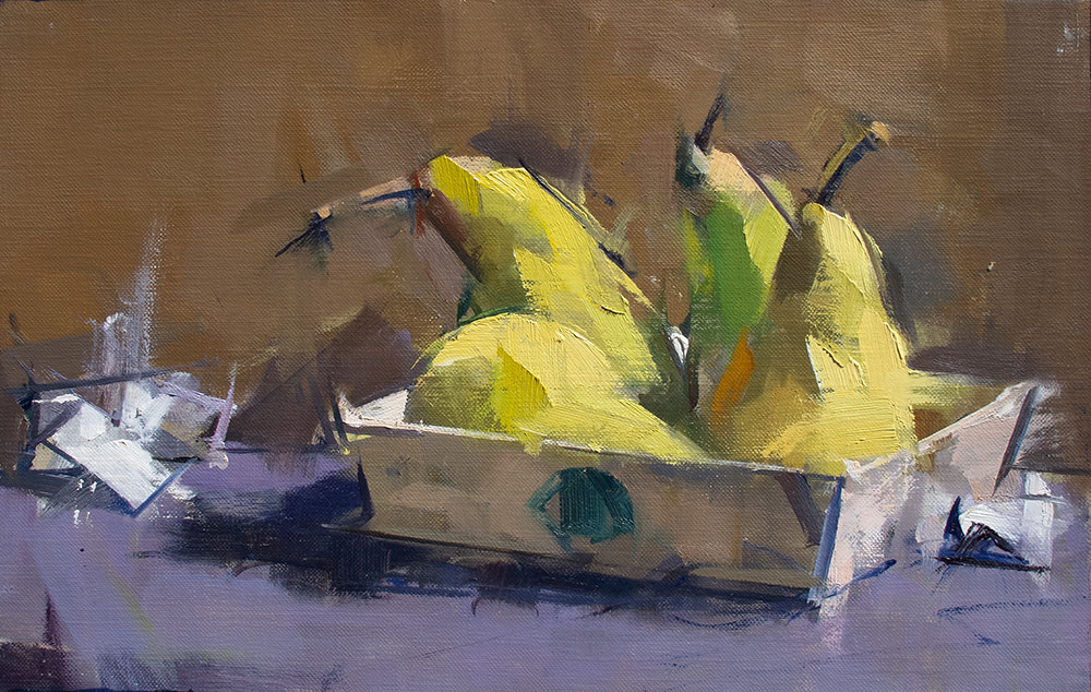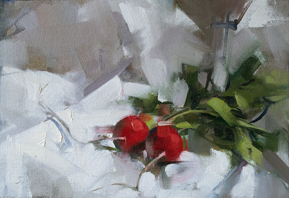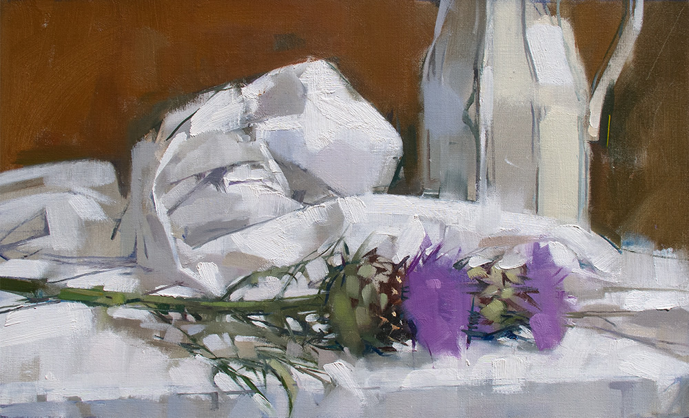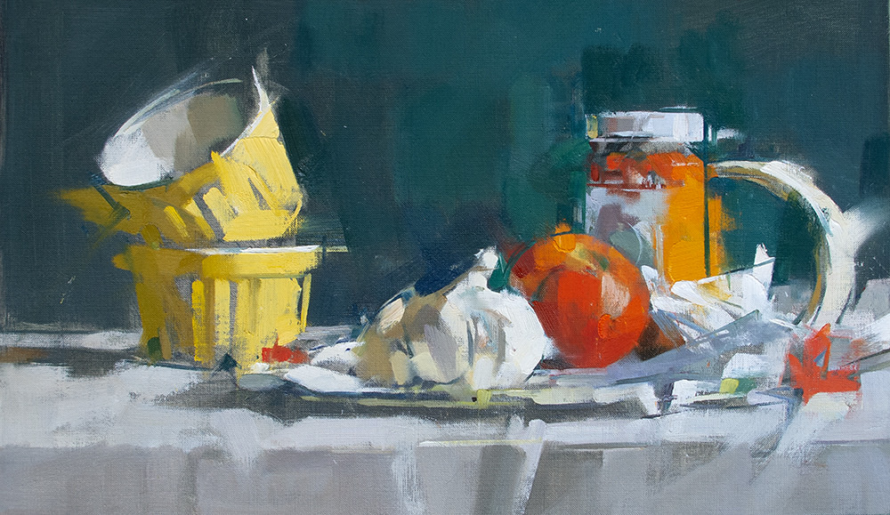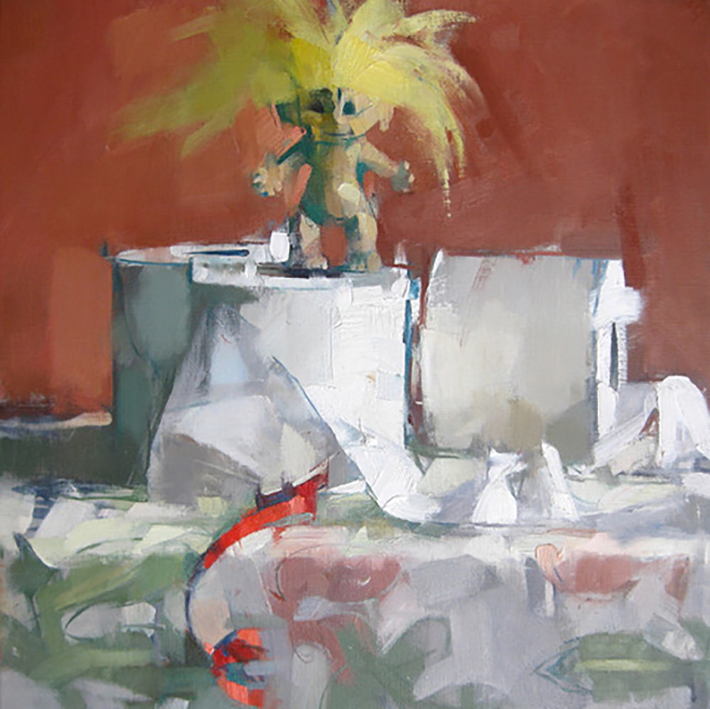“What memories are carried by a tossed off article of clothing? By the detritus of the table? Why paint a shirt on a hanger? Rolls of toilet paper? Melon rinds on a cracked plate? Why paint from life at all? My paintings are not story telling in any narrative sense of the word, but the truer to life they are, the more convincingly they create the experience of having existed, and then the more they incite our human nature which wants to make stories of everything. A shirt freshly pressed is flat and neutral. But a shirt that has been worn, disturbed with folds, wrinkled by a human body who has moved, behaved and sweated, a shirt that has been worn and worn down and then insouciantly thrown on the hanger; that shirt contains the seeds of a narrative I will discover through the investigative and thrashing process of painting. I am very taken by the objects of daily life after they have been used. It’s there where we can see life passing; the remains of something that has happened. And that is what a painting is to me. It is something that has happened. I’ve painted figures all my life, portraitly confronting the direct gaze or voyeuristically looking over a shoulder, but I find that painting the objects, the stuff that figures have held, worn or used, offers a subtle poignancy and is suggestive of deeper interpretations.“