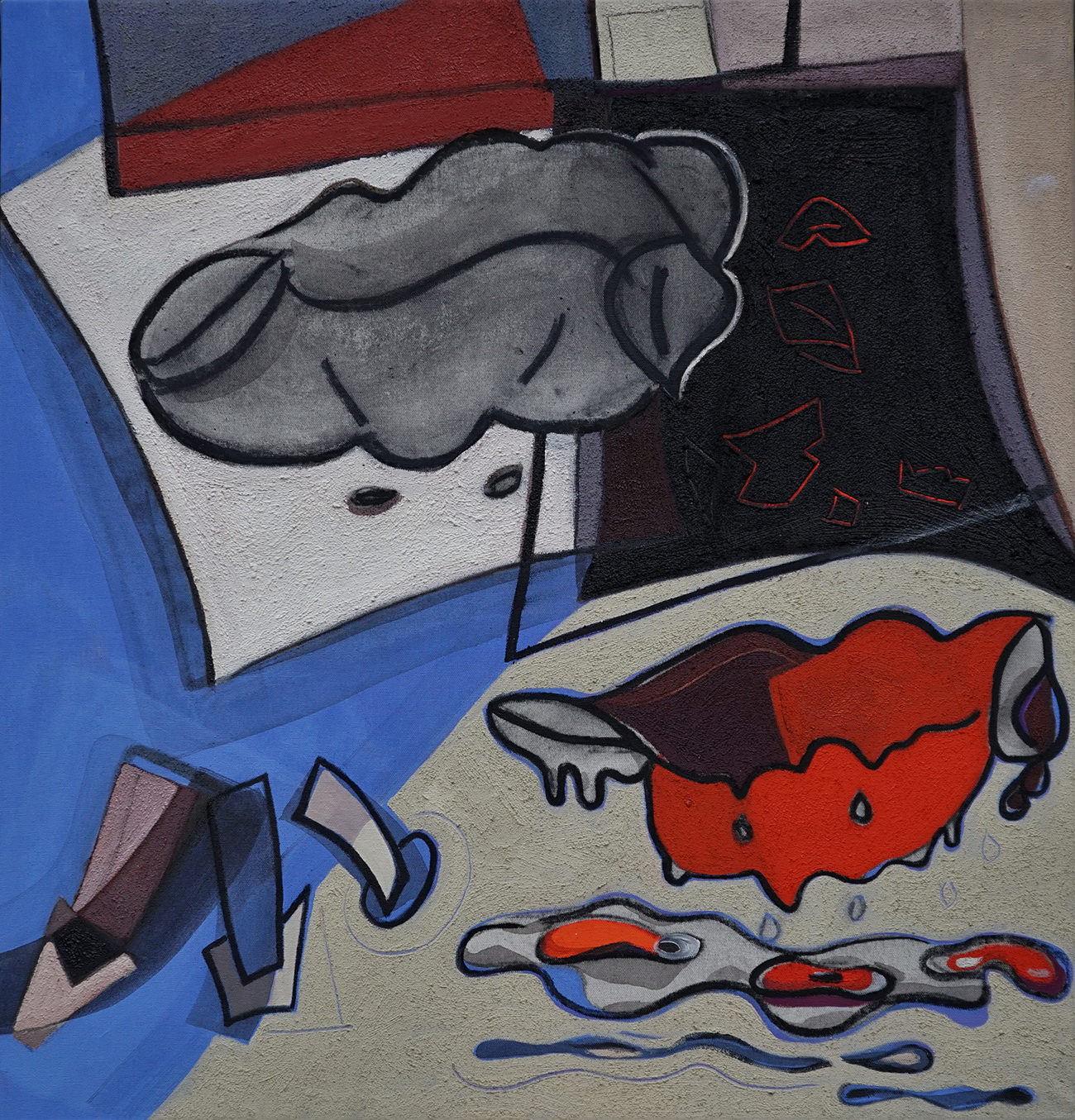 Questi oggetti-forme, delimitati da nette linee di contorno, determinano un contesto di incontro inusuale, occupano lo spazio sovrapponendosi, fondendosi l’uno dentro l’altro ma rispettando ognuno la propria identità così cara all’artista che intenzionalmente ne sottolinea le affinità e le differenze.