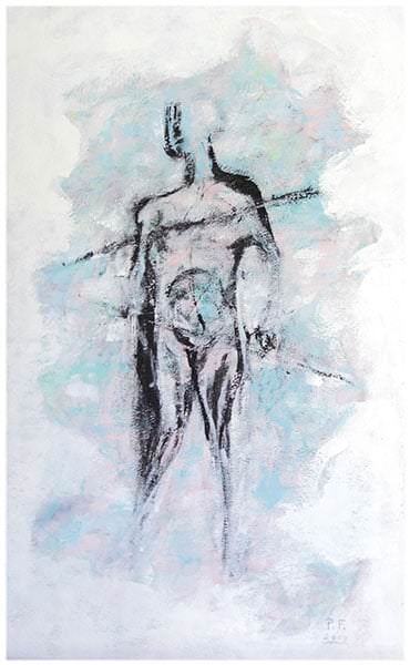 Ciò risulta evidente anche nel volto malinconico che campeggia su di un grande spazio bianco, sottolineando drammaticamente il rapporto chiaro – scuro, vuoto (bianco) e pieno (segni-figure scure). Un giovane torso maschile fluttua in un "soffice" spazio bianco, improvvisa e fugace apparizione.