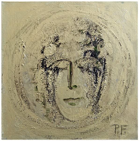 Tra le opere recenti presentate vi sono coppie "primigenie", figure dai corpi longilinei, colte in una dimensione idilliaca, mentre dialogano silenziosamente in una atmosfera vibrante dalle delicate tonalità azzurre e viola. Così muto risulta anche il volto "sacro" rappresentato con gli occhi chiusi in un clipeo dorato, che annulla ogni riferimento spaziale e temporale. Tra sperimentazioni e conferme continua incessante l'attività di Peggy.