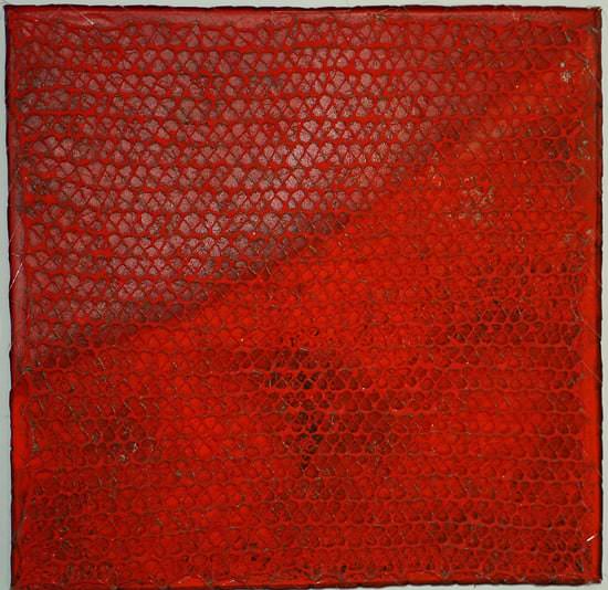 Le reti della Redolfi, una volta che le sue mani hanno terminato di intrecciarle, vengono tese su telai di legno e quindi dipinte con un colore denso che, una volta asciugatosi, dà loro consistenza materica.