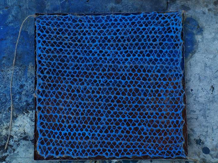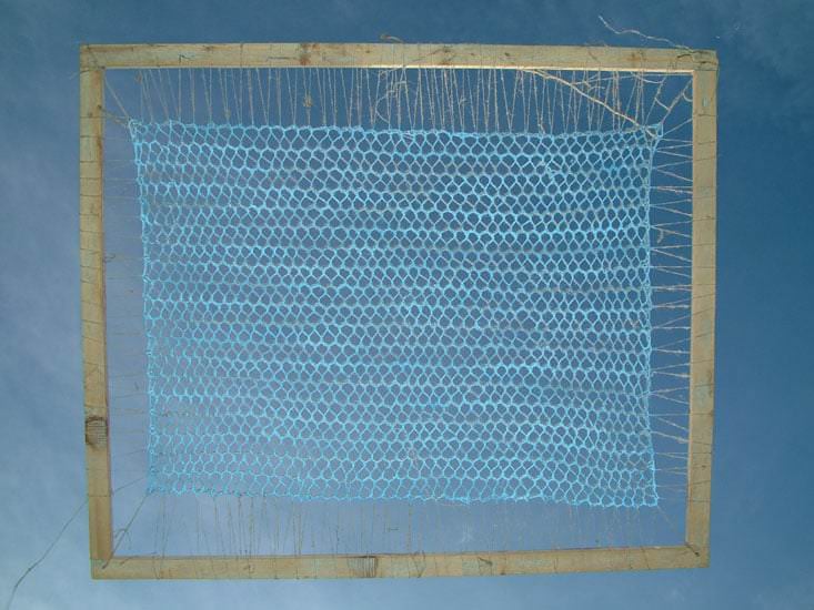 Una volta dipinte le reti lasciano la loro “cornice” lignea, dentro la quale hanno riposato essiccandosi, e vengono appese, sospese, nello spazio.